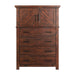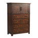 The Jax 5-Drawer Chest is the perfect rustic piece for your bedroom! This vertical chest comes with four, large spacious drawers and one cabinet up top. This rustic chest comes in a rich, cherry color and features distressed markings throughout. Dark bronze drawer pulls make it easy to get to your belongings quickly. Open the cabinet to find a large, open space to store away your bulkier items, such as sweaters. The top drawer is felt-lined keeping your more valuable items protected. Bevel edges and straight legs complete the look of this rustic style chest. Features: • Four Drawers • One Cabinet • Bronze Drawer Pulls • Dust Proofing Layer on Bottom Drawer • Distressed Markings Throughout • Hooded Tops • Straight Legs • Cherry Finish • Anti-Tipping Dimensions: Depth: 18.0" x Width: 38.0" x Height: 54.0" Weight: 167.0 lbs.