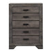 The Nathan 5-Drawer Chest is what rustic farmhouse dreams are made of! This vertical chest comes with five, spacious drawer; perfect for keeping all of your belongings neatly stored away. The top drawer is felt-lined and is a great spot to keep your more delicate items. The bottom drawer features a dust proofing layer to help protect your belongings. The weathered, gray oak finish pairs beautifully with the rustic metal drawer pulls. Sleek, clean lines and bracket feet complete the look of this rustic, chest of drawers. Features: • Five Spacious Drawers • Dust proofing on bottom drawers • Metal Hardware • Felt-Lined Top Drawer Dimensions: Depth: 16.0" x Width: 35.0" x Height: 51.0" Weight: 153.0 lbs.