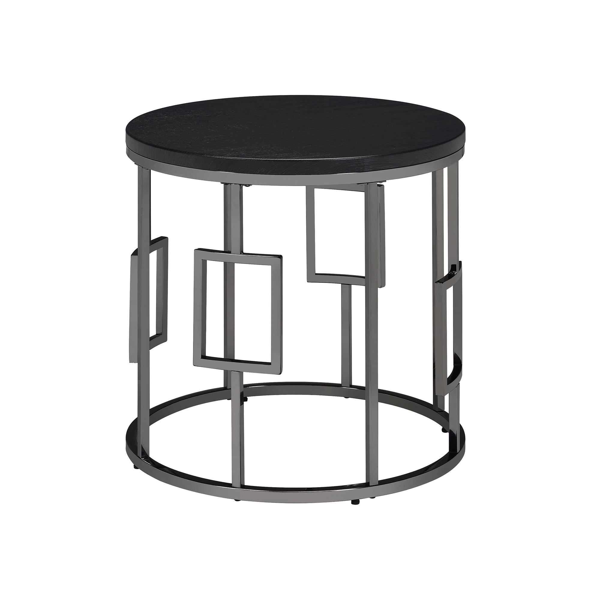 Ester Round Coffee Table - Round Coffee Table - Chrome, Metal Base - Drum Style Table - Intricate Design along Table Base - Contemporary Design - Wooden Table Top in Sleek, Black Finish Particle Board Metal 36 D x 36 W x 19 H, 45lbs. 1 Year Limited Manufacturer Warranty