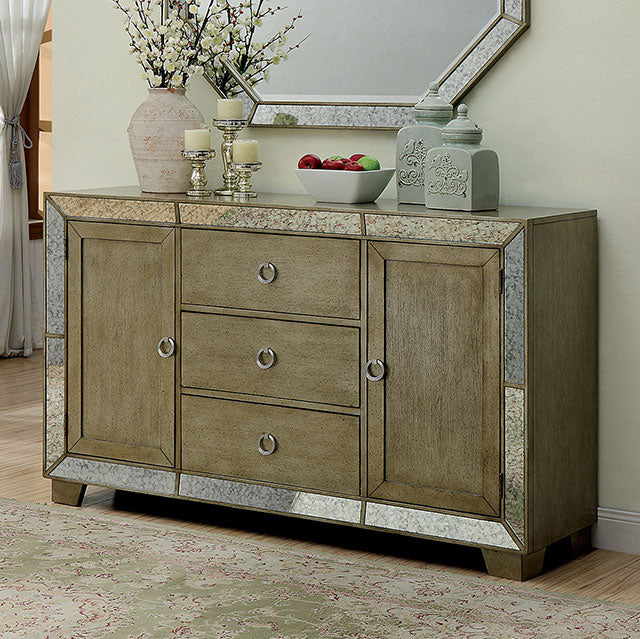 Dine in style with this fabulous Antique Gold finished dining set. Antique mirrors accent the set, adding soft reflections that glimmer in natural light. Cushioned chairs are elegantly detailed with nailhead trim and single tufted accents. Dazzle with the geometrically designed mirror and easily organize dinnerware with the dining server. Intricate and opulent, this dining set provides comfortable seating with an expandable leaf that ensures plenty of space for everyone.