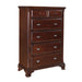 The Canton 5-Drawer Chest is where style and function come together to create one awesome chest of drawers! This vertical chest comes with five, spacious drawers, perfect for neatly storing away all of your belongings. The bottom drawer has a dust proofing layer to help protect your items. Store away your more delicate items in the felt-lined top drawer. The gorgeous cherry finish pairs beautifully with the antique pewter drawer hardware. The traditional design will be a staple in your home year after year. Features: • Beautiful Cherry finish • Drawers feature full extension metal side glides with built in stops. • Dust proofing on bottom drawers for added protection • Features five drawers for ample storage space • Top drawer is felt lined • Antique pewter look pulls and knobs Dimensions: Depth: 18.0" x Width: 38.0" x Height: 54.0" Weight: 151.0 lbs.