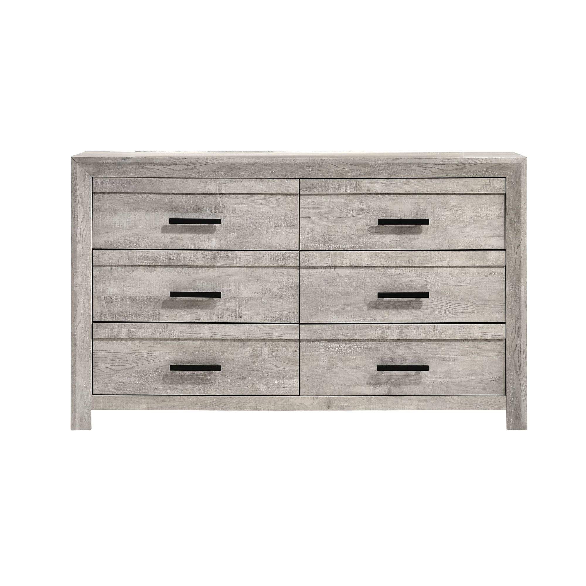 The Ellen 6-Drawer Dresser in White is the perfect addition to your bedroom. Crafted of solid wood, mdf, and plywood in a ash white finish. Exposed wood grain detailing and fashioned with rustic-inspired distressing for character. Beautiful black drawer pulls for a modern approach to a rustic look. Features six drawers and dust proofing at bottom drawer for protecting your clothing from dust. The Ellen 6-Drawer Dresser has a natural-looking aesthetic, perfect for any farmhouse or transitional style bedroom. Features: • Includes Six Drawers • Black Finish Drawer Pulls • Dust Proofing at Bottom Drawer • Paper Finish • Woodgrain Details • Distressing throughout Dimensions: Depth: 17.0" x Width: 63.0" x Height: 38.0" Weight: 128.0 lbs.